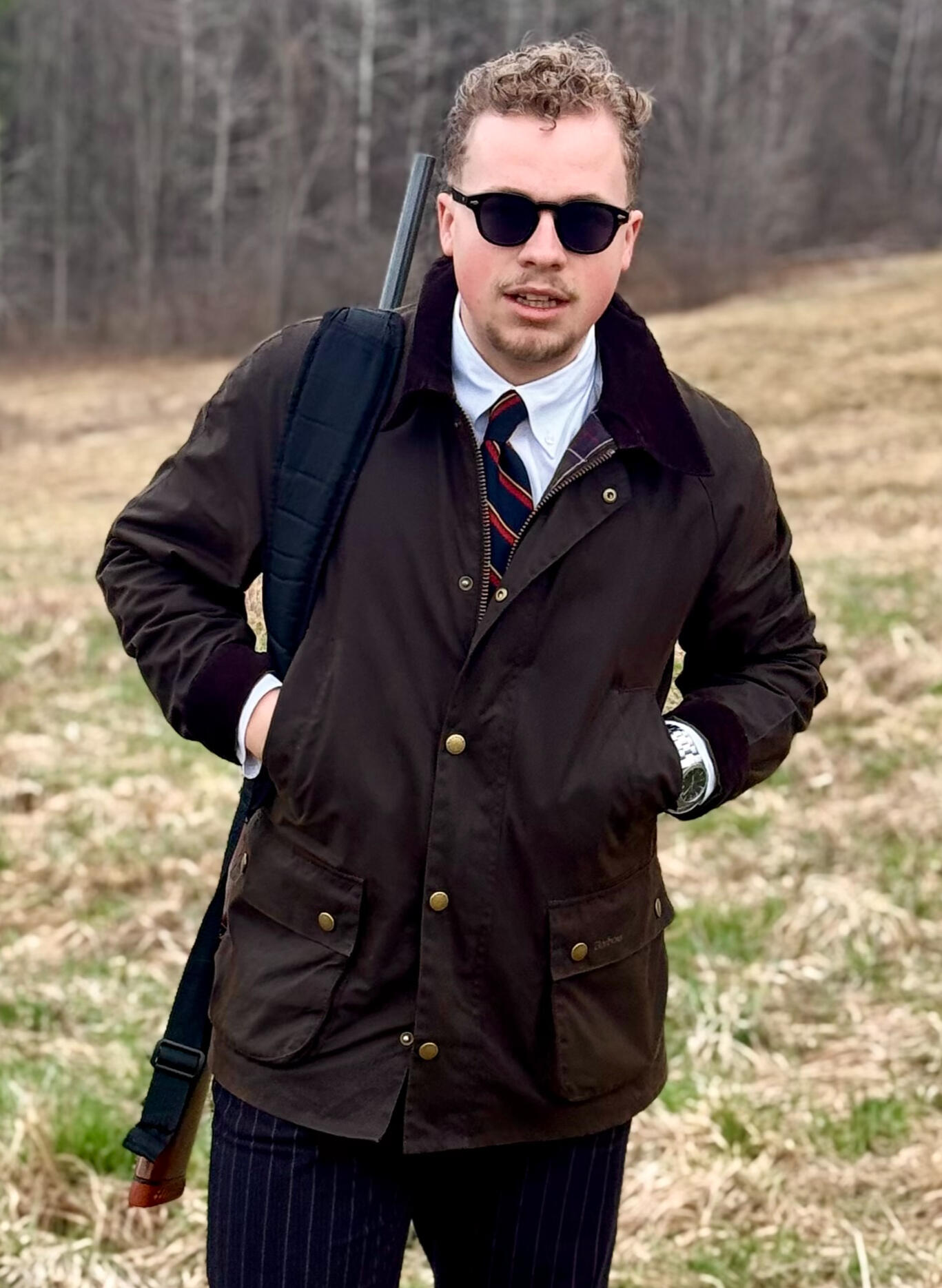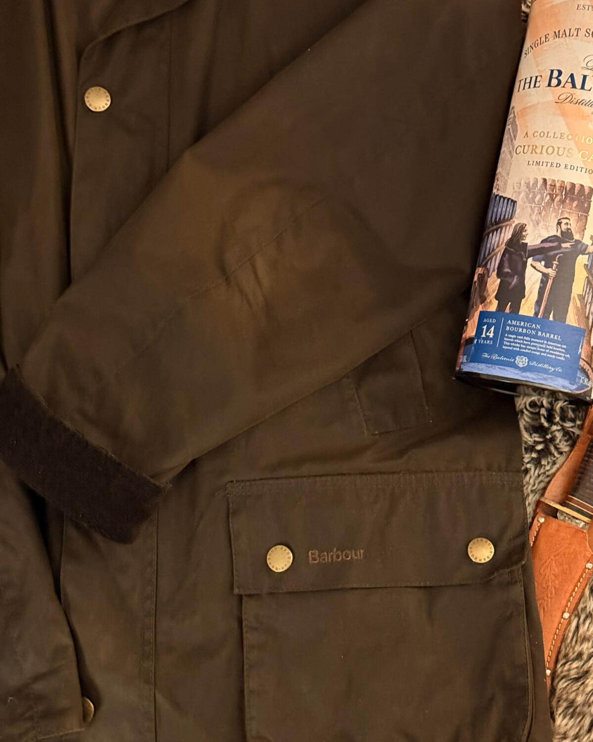 First, the Ashby Barbour. Waxed cotton, rugged charm, and a scent that recalls damp woods and distant bonfires. It’s a jacket that’s lived—creased, scuffed, and softened by time. I wear it on early walks through the trees, or when the farmer’s market calls before the sun’s fully up. The pockets are purposeful—deep enough for gloves, keys, or a folded map. And the patina? That’s earned. There’s a quiet authority to the Ashby. Waxed cotton, born of British countryside necessity, it’s a jacket that doesn’t shout, but owns the room. It’s dependable, understated, and quietly confident.